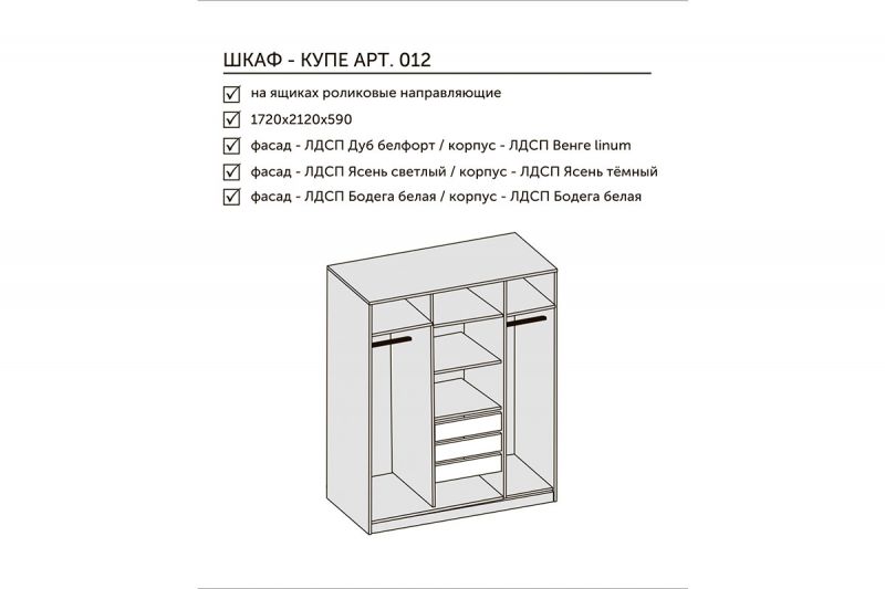 Слева и справа симметричные отделения с двумя полками, под ними металлическая штанга. В центре отделение с тремя полками и тремя выдвижными ящиками на роликовых направляющих.